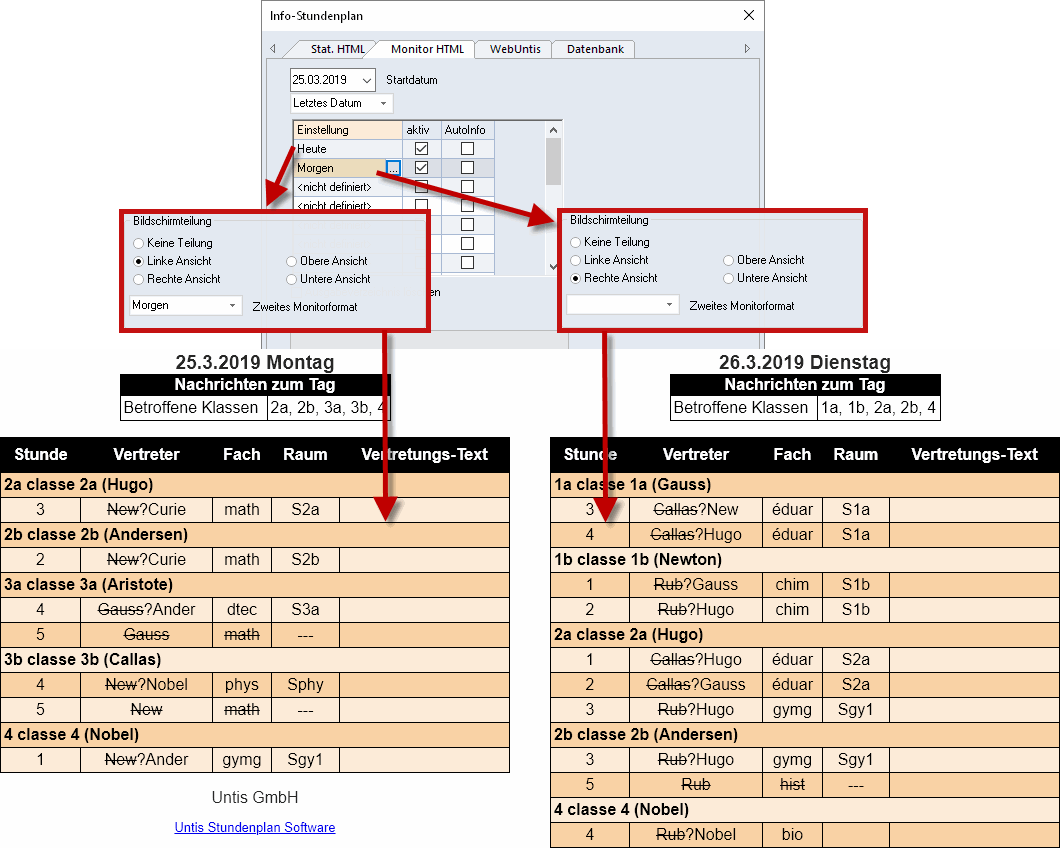 Auf einem Monitor können unterschiedliche Informationen angezeigt werden. So können etwa auf der linken Seite die Vertretungsdaten des aktuellen Tages und auf der rechten Seite die des nächsten Tages ausgegeben werden. Die dazu notwendigen Einstellungen tätigen Sie auf der Karteikarte "Spezielles".