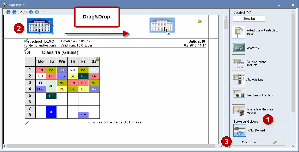 You can include images and graphs on your printed timetables. The image must be available as a .bmp, .gif, or .jpg file. Depending on the image or graph you want to include, you can use this function to print your school logo or a background for the timetable. 1.Click on 'background image' in page layout, select the image in .bmp format you want to have as a background image. 2.Click on the option 'Move image' to drag the image to its new position. 3.Deactivate the option 'Move image' to fix it at the position you want.