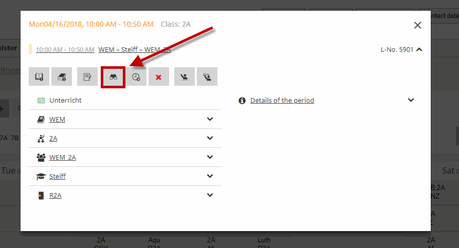 Note: End date If you change the end date, you can also perform this room change for a longer period of time. If you, for instance, change the room for the subject BU on Monday then all Monday lessons of the subject BU will also be changed until the end date.
